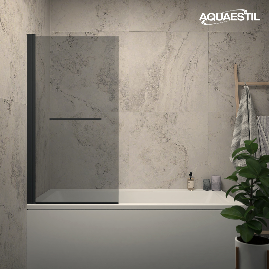 Eine Duschwand für moderne rechteckige Badewannen mit integriertem Handtuchhalter. Möglichkeit des Faltens in beide Richtungen. Verfügbare Optionen aus silbernen, mattschwarzen oder mattweißen Profilen und transparentem oder grauem gehärtetem Glas.