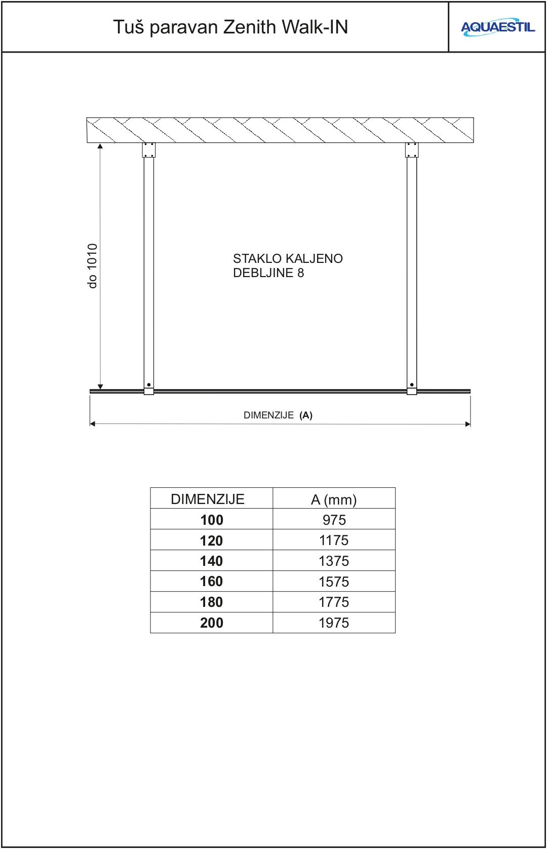 Zenith je moderna fiksna staklena stijena koja se postavlja paralelno sa zidom na koji je naslonjena tuš kada ili prostor za tuširanje izveden od keramičkih pločica, a u kombinaciji s jednom od plitkih Aquaestil tuš kada ili prostorom izvedenim od pločica, sačinjava moderni “walk-in” kupaonski koncept. Brtvljenje na spoju tuš kade / pločica i fiksne stijene osigurava se aluminijskim U profilom.
