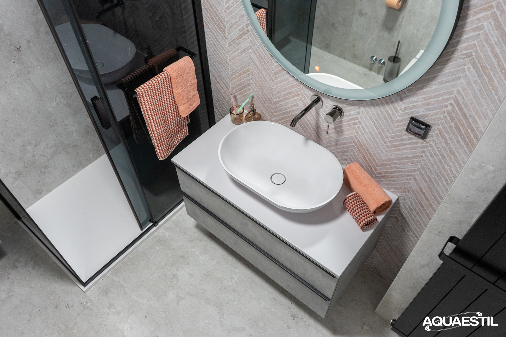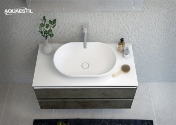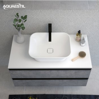 Die Waschbecken der Aquaestil Badezimmermöbel bestehen aus Mineralguss oder, in bestimmten Serien, aus Keramik. Für die Reinigung und Pflege der Aquaestil Waschbecken können Sie das Aquaestil Reinigungsmittel für Acryl- und Glasflächen oder ein standardmäßiges Badezimmer-Reinigungsmittel verwenden. Zur Entfernung von Kalk empfehlen wir Essig oder spezielle Mittel zur Kalkentfernung, die keine Mikrogranulate enthalten, die die Oberfläche des Waschbeckens zerkratzen könnten.