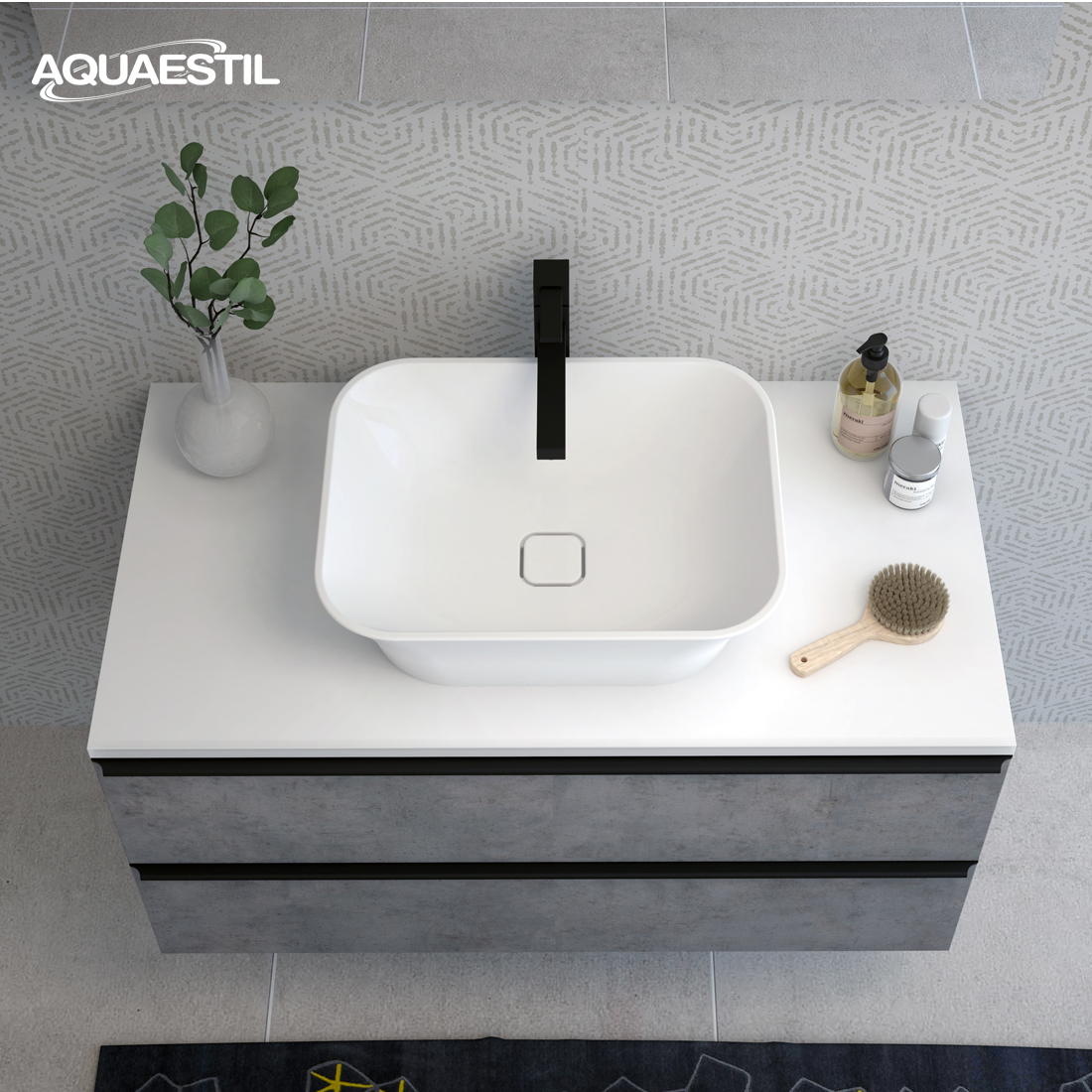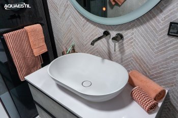 Aquaestil Waschbecken werden aus gegossenem Marmor hergestellt. Gegossener oder Mineralmarmor ist ein fortschrittliches Material, das aus natürlichen Mineral- und Steinpartikeln, Polyester und Harz besteht. Dieses Material wird in speziell entworfenen Formen gegossen, und jedes Waschbecken durchläuft eine sorgfältige Endbearbeitung und eine Gelcoat-Behandlung, um eine makellos glänzende Oberfläche zu schaffen, die kratzfest ist.
