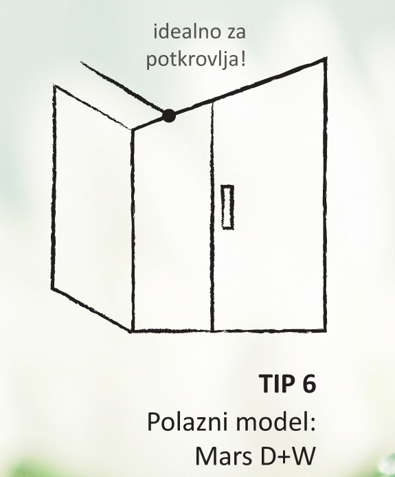 Tip 5 - Gotovo sve modele koji imaju vrata na otvaranje (ne klizna) moguće je izraditi s kosim gornjim dijelom stakla koje prati strop potkrovlja ili slično. Potrebno je dostaviti točnu visinu na početku i kraju stakla te skicu s ostalim željenim dimenzijama.