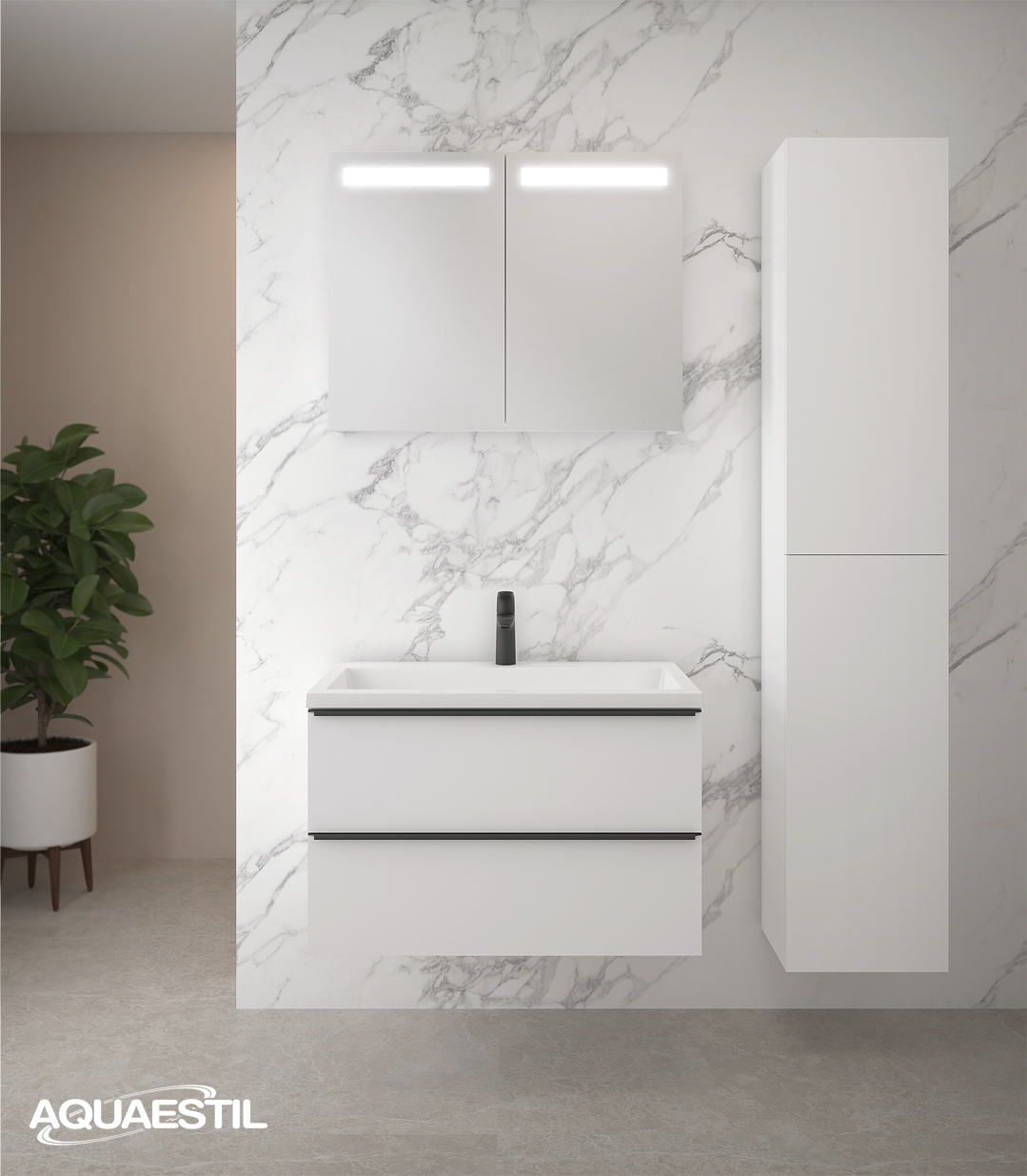 - Boje prezentirane na web stranici mogu u manjoj mjeri odstupati u odnosu na stvarne boje kupaonskog namještaja. Uzorci boja namještaja mogu se vidjeti uživo kod ovlaštenih Aquaestil maloprodajnih partnera ili u našem izložbenom salonu.