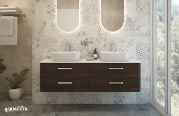 Il materiale dei mobili da bagno Aquaestil è resistente all'umidità, ma non completamente impermeabile. L'esposizione prolungata a livelli elevati di umidità e acqua può causare il rigonfiamento dei bordi delle parti in legno dei mobili e la possibile corrosione degli specchi.