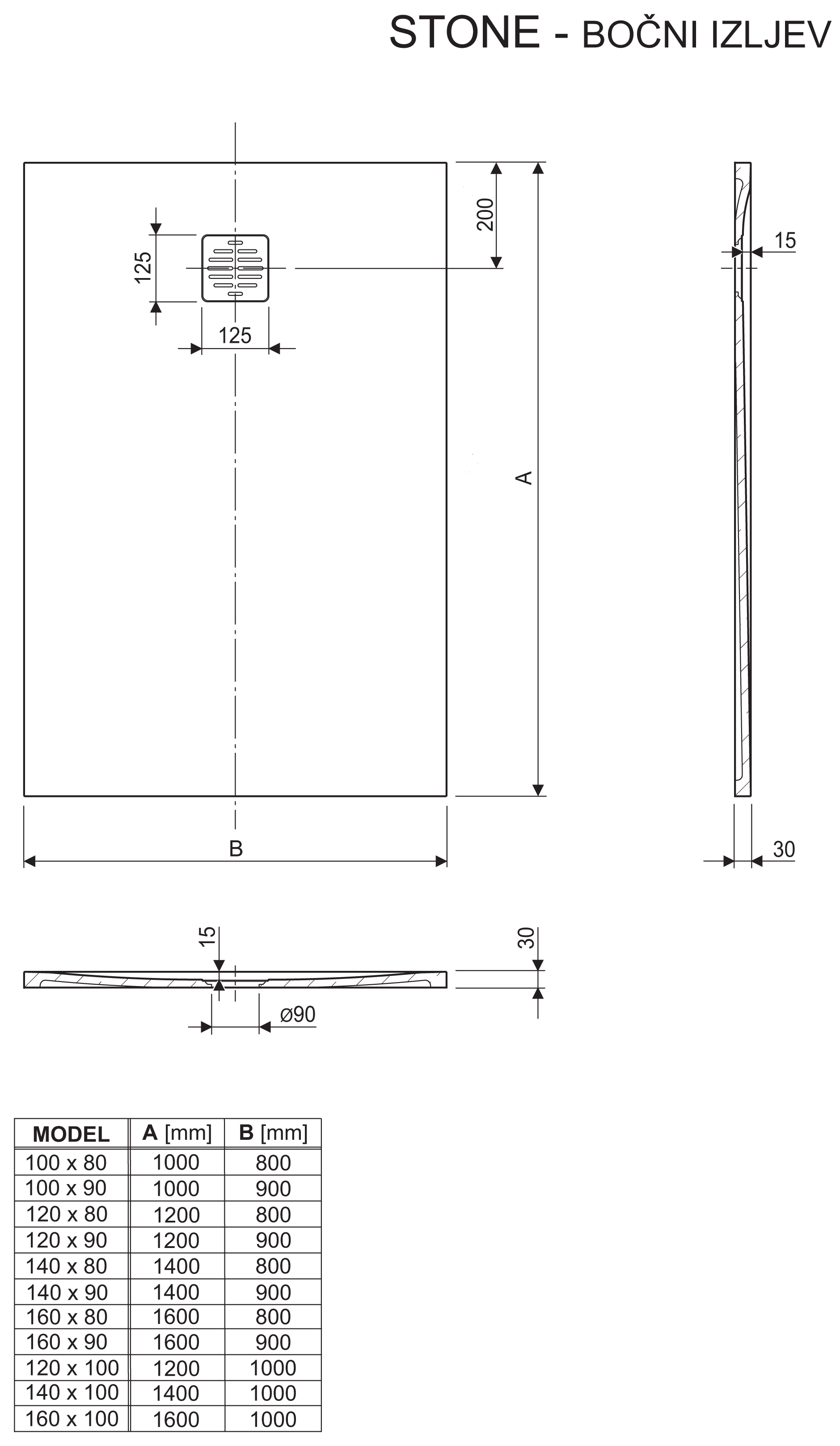 • Verificare la posizione del sifone per ciascuna delle dimensioni del piatto doccia rettangolare Stone sui disegni nel capitolo "informazioni tecniche".