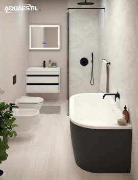 La vasca centro stanza Slim Black Wall è caratterizzata dalla sua elegante forma ovale con troppopieno a fessura nonché da pannelli di rivestimento nero opaco trattati in fabbrica con uno strato anti-impronte. Viene fornita con pannelli di rivestimento premontati e fissati, kit con piletta di scarico automatico clic-clac e tubo flessibile per il collegamento allo scarico. In fase di installazione è sufficiente collegare il tubo flessibile allo scarico, fissare la vasca al pavimento, riempirla...