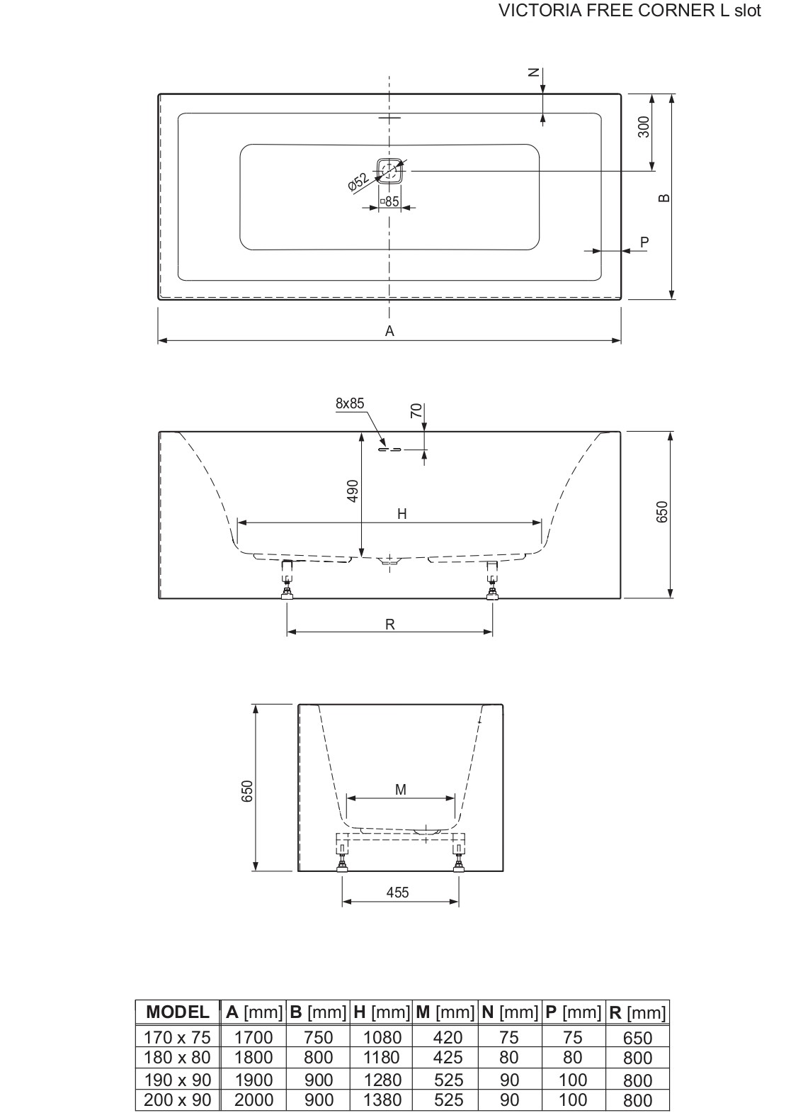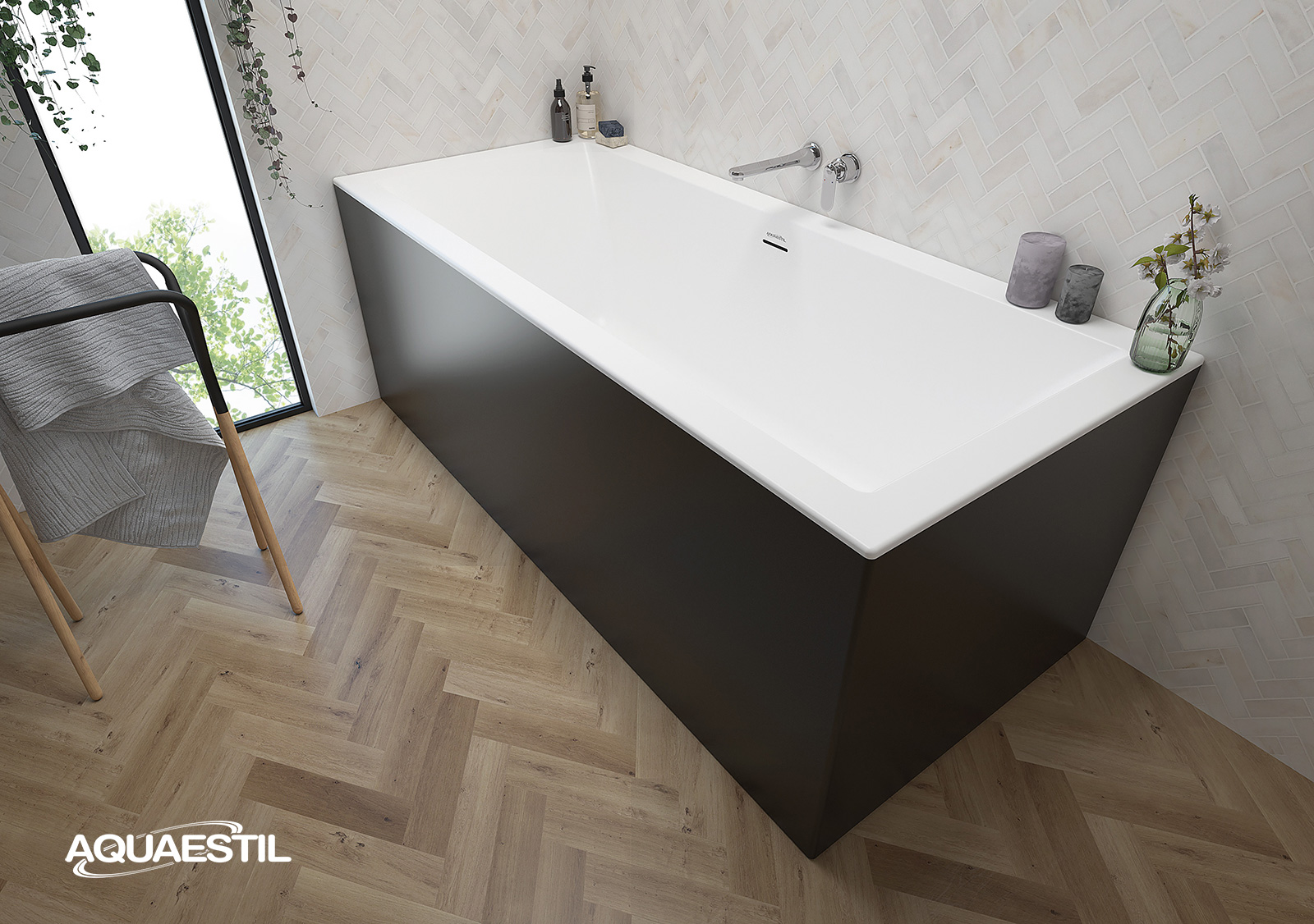 Victoria Free è un'elegante e moderna vasca rettangolare con piedistallo integrato e pannelli collegati senza soluzione di continuità. La vasca viene consegnata con un telaio montato in fabbrica e un set troppopieno-scarico con troppopieno "slot" e valvola sifone "click-clack".